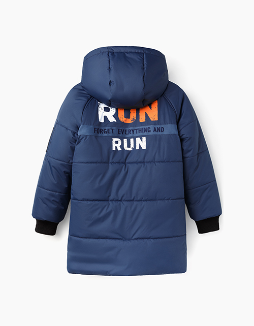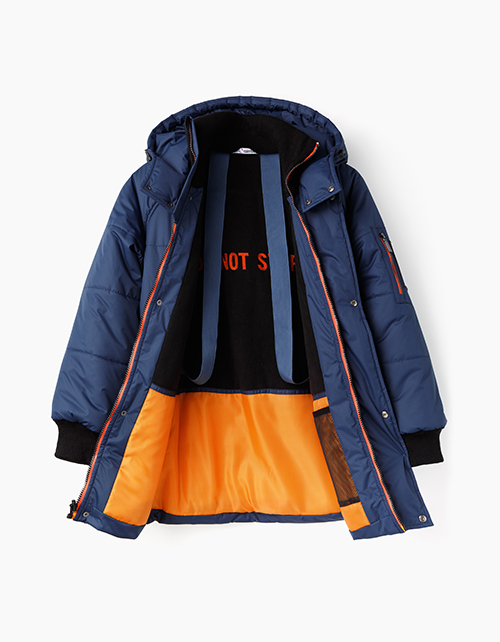 Теплая куртка на синтепоне и флисе для мальчика-подростка. Прямой силуэт, горизонтальная стежка. Рукава реглан с трикотажными манжетами. Контрастные акценты в виде принтов, тесьмы застежек-молний и вышивки на подкладке