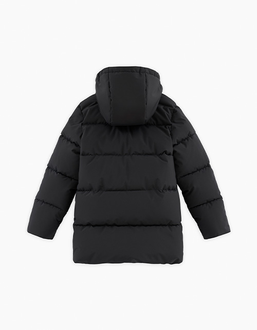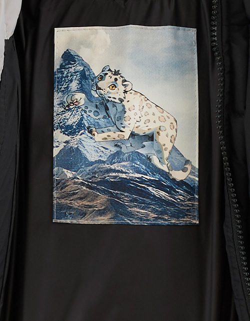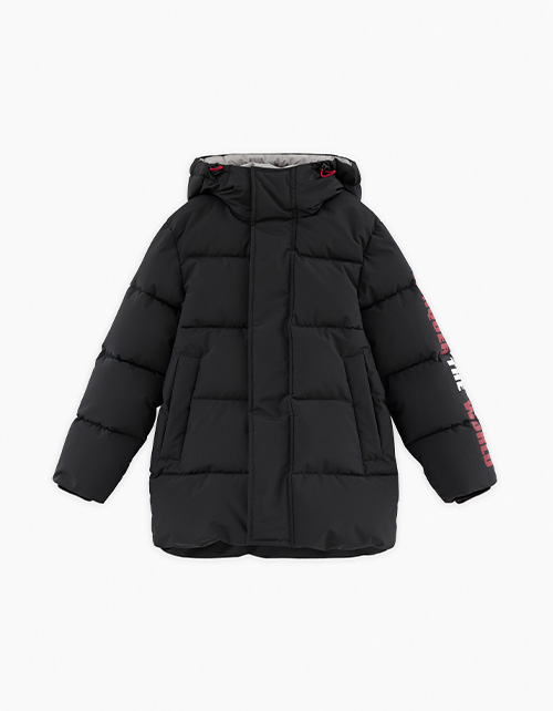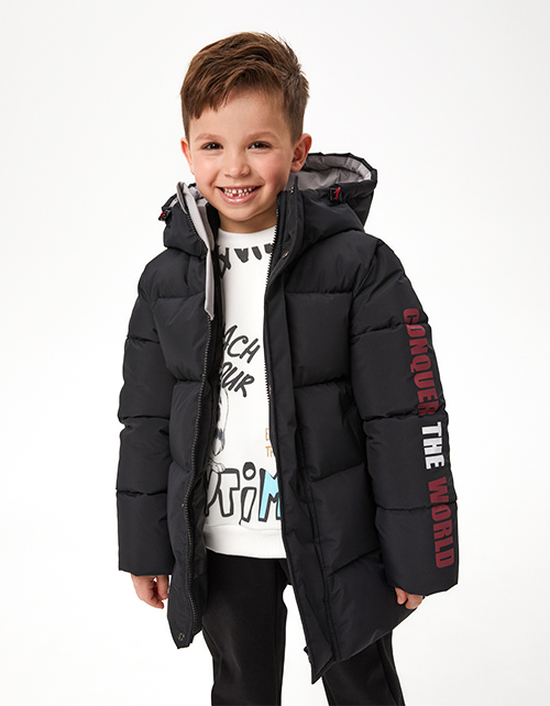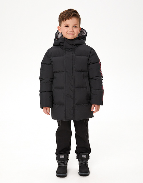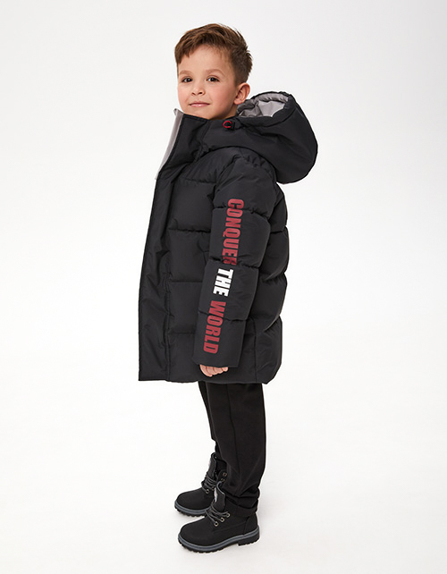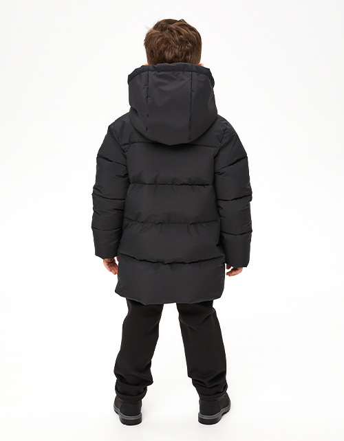 Чёрная куртка на гипоаллергенном синтепухе. Плащёвая матовая ткань. Ветрозащитная планка на кнопках. Воротник-стойка, переходящий в глубокий капюшон с утяжкой. Комбинированная подкладка из флиса и нейлона. Авторский декор. Рекомендовано до -20.