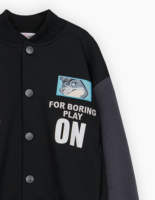 Стильный чёрный бомбер для мальчика. Прямая объёмная модель с контрастными рукавами. Воротник-стойка и низ изделия из рибаны. Бомбер на удобных кнопках. Изделие декорировано вышивкой с аппликацией.