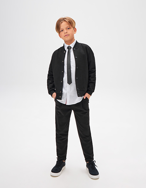 Чёрный школьный жакет-бомбер для мальчика. Модель прямого силуэта с застёжкой на кнопки. Изделие с воротником-стойкой.
