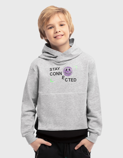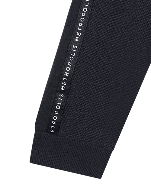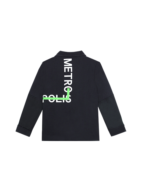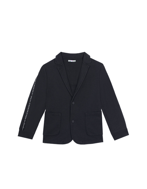 Черный пиджак прямого силуэта для мальчика. Застежка на две кнопки, накладные карманы. Лампасы по рукавам. Дизайнерское оформление в стилистике капсулы "Мегаполис".