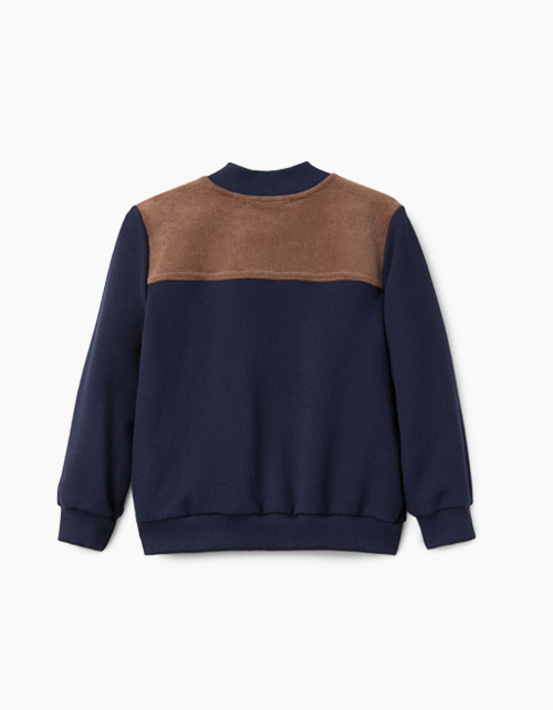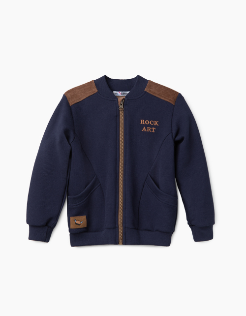 Жакет из темно-синего футера пике с начесом. Спинка с контрастной кокеткой из вельвета. Вышивка на груди и кармане в тон кокетке. Прямой силуэт. Застежка-молния. Манжеты, горловина и отделка карманов из рибаны