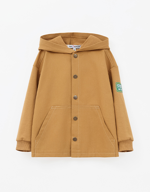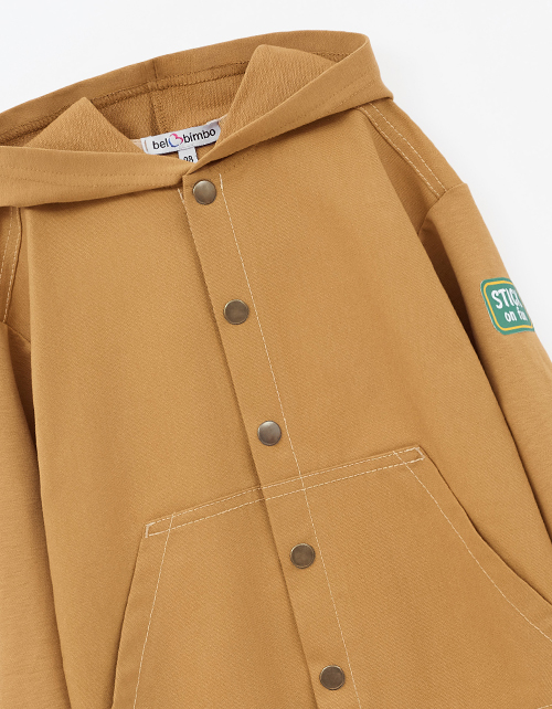 Утилитарный жакет-толстовка. Модель прямого силуэта из мягкого футера с браш-эффектом и твила дарит комфорт и практичность. Капюшон и накладные карманы добавляют удобства, рибана держит форму. Застёжка на кнопки, акцент - крафтовая жаккардовая лейба.