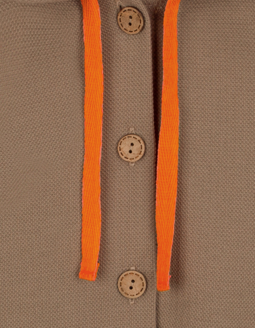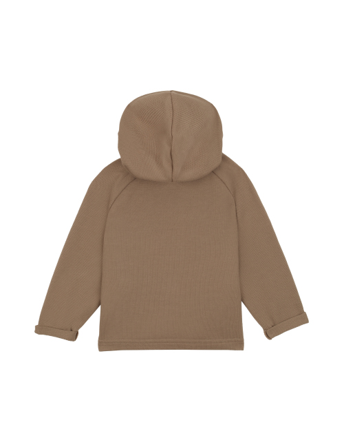 Повседневный жакет для мальчика прямого силуэта с длинным рукавом. Изделие дополнено капюшоном и манжетами на рукавах. Жакет имеет застежку на пуговицы на передней части и кулиску в районе горловины. Украшен принтом по низу изделия.