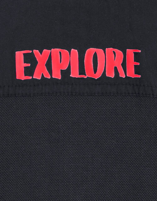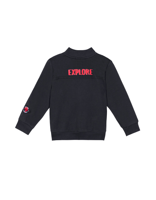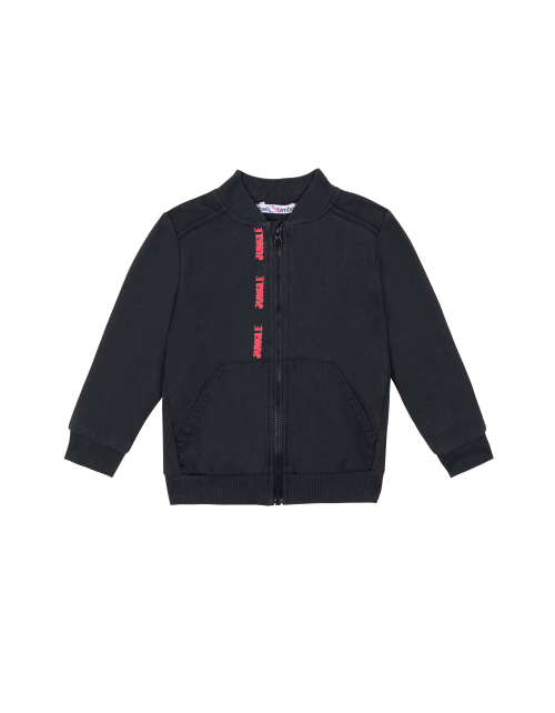 Черный жакет для мальчика с центральной застежкой и карманом-кенгуру. Воротник и манжеты из рибаны. Принт-надпись в стилистике капсулы "Джунгли TRIP".