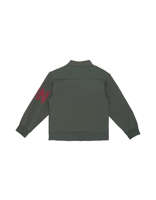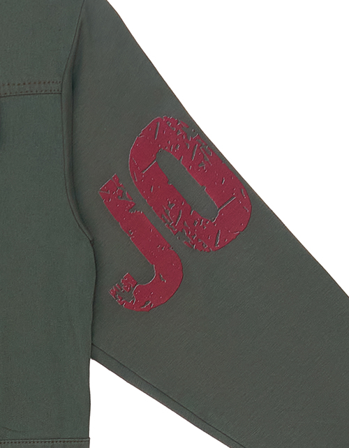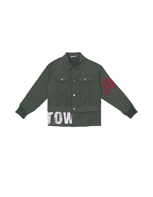 Жакет для мальчика прямого силуэта цвета хаки. Застежка на пуговицы-болты. Комбинированный материал. Имитация карманов. Дизайнерское оформление в стилистике капсулы "Городские джунгли".