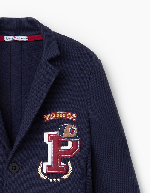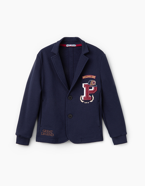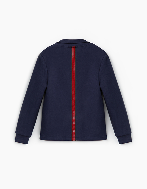 Жакет прямого силуэта с застежкой на две пуговицы для мальчика. Выполнен из темно-синего футера "пике". Декорирован вышивкой на груди слева и на правой полочке снизу. Вдоль спинки отделка контрастной тесьмой.