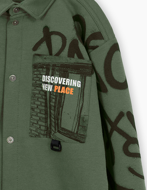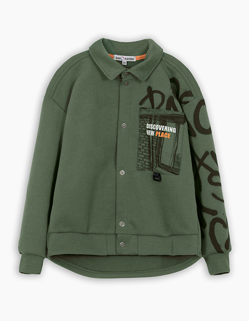 Жакет-рубашка в трендовом оттенке листа шалфея для мальчика. Авторский принт в стиле граффити. Жакет на кнопках, с отложным воротником и накладным карманом. Рибана по низу спереди, спинка изделия - рубашечного типа. Модель из футера с браш-эффектом.