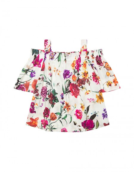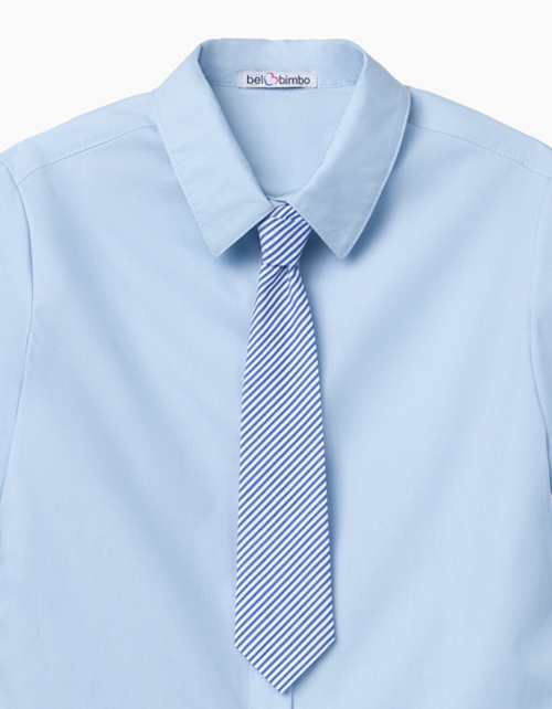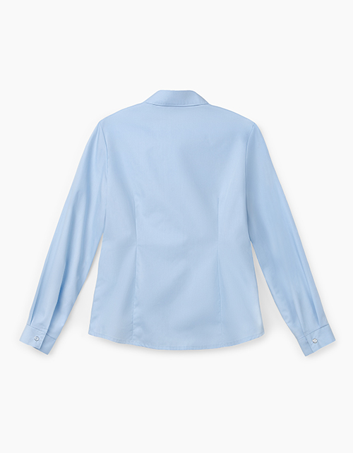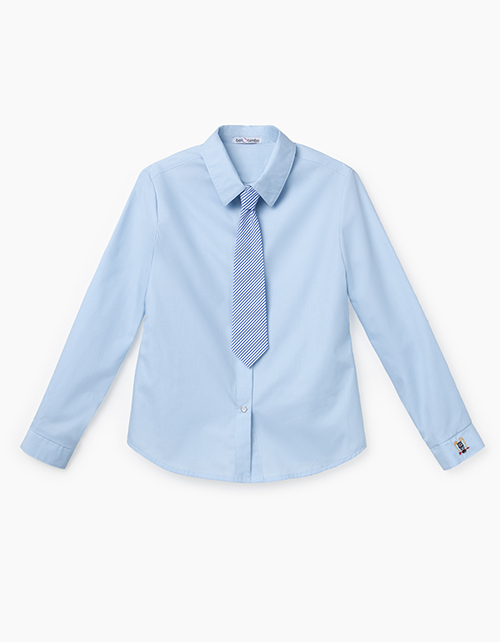 Голубая блузка полуприталенного силуэта, с длинным рукавом и рубашечным воротником. С застежкой на пуговицы. Выполнена из сорочечной ткани. Декорирована фирменной вышивкой на манжете и галстуком из ткани в тонкую бело-голубую полоску.