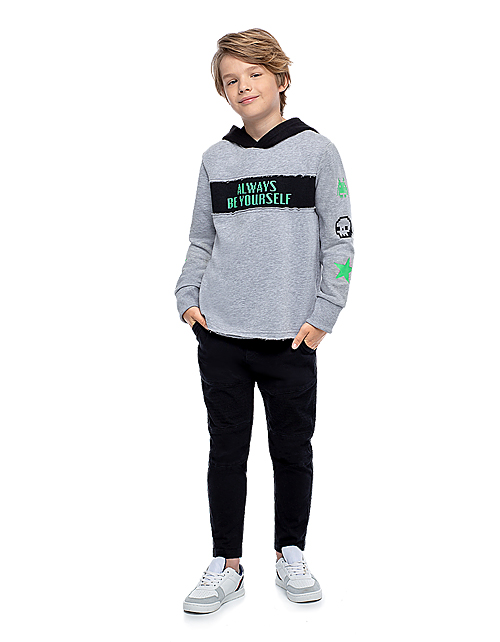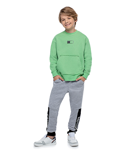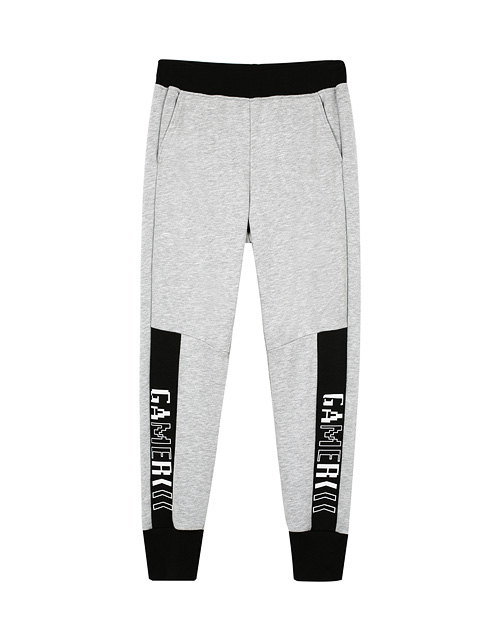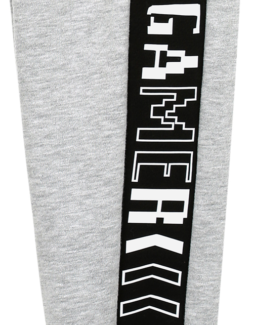 Брюки для мальчика в спортивном стиле зауженного силуэта дополнены удобным поясом на резинке, двумя карманами, широкими манжетами и принтом в виде надписей. Трикотажная ткань футер обеспечивает износостойкость изделия и комфорт в носке.