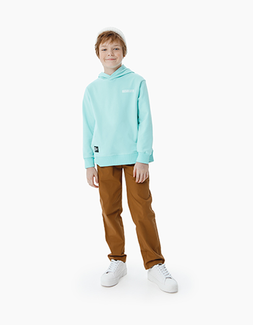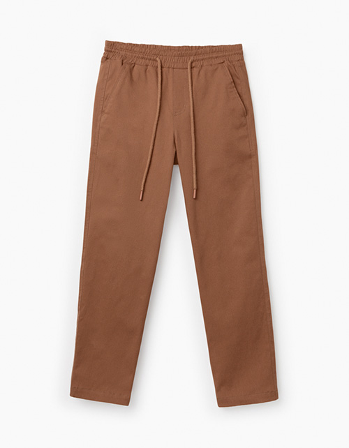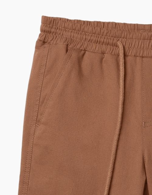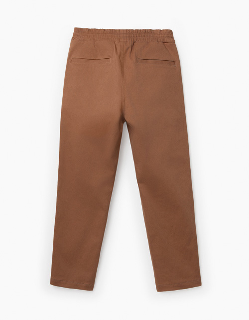 Трендовые брюки из твила природного песочного оттенка для мальчика. Комфортная зауженная модель, со средней посадкой. Изделие на мягком эластичном поясе, с завязками-регулировками объёма. Брюки дополнены карманами-хулиганами спереди и прорезными сзади.