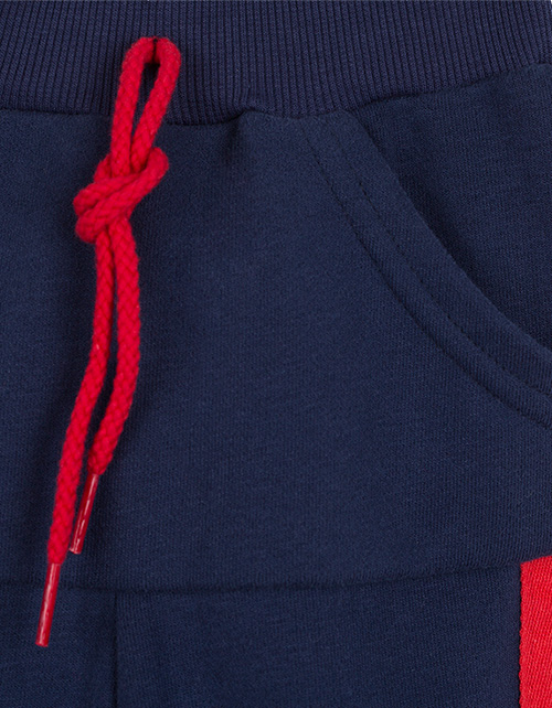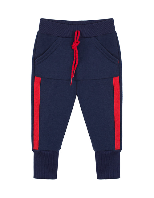 Брюки для мальчика в спортивном стиле имеют зауженный силуэт и дополнены удобными манжетами, внутренними карманами, контрастными лампасами и шнурком. Ткань футер гарантирует износостойкость изделия и дарит комфорт в носке.