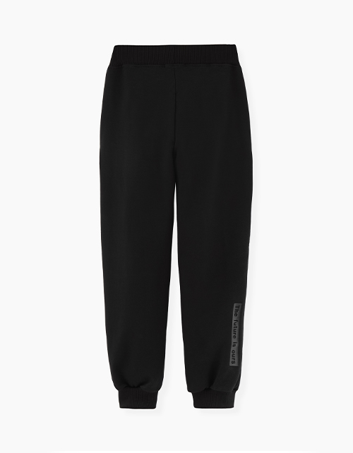 Черные брюки-джоггеры для девочки. Стильная модель подходит для создания повседневных образов. На эластичном поясе с боковыми карманами в шве. Декорированы принтом-надписью.
