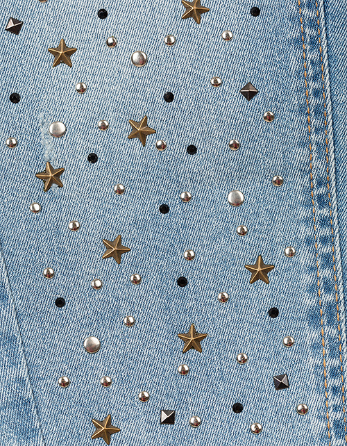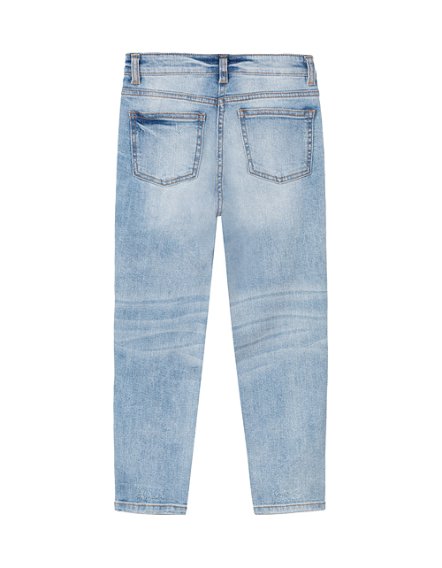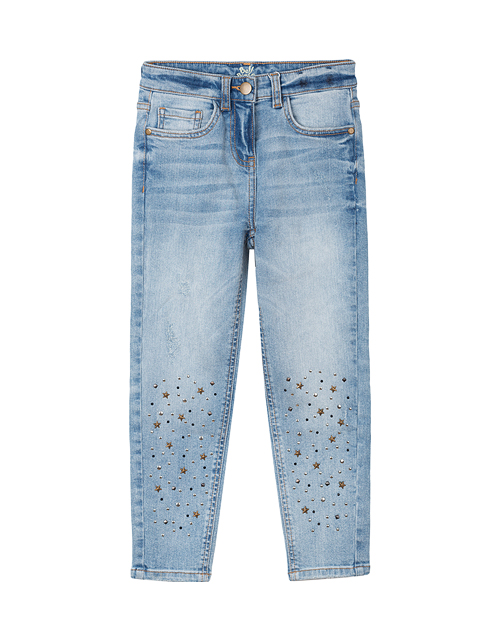Удобные и стильные джинсы - самая необходимая вещь в гардеробе современной девочки. Они станут универсальной основой кэжуального образа. Особую актуальность изделию придаёт зауженный книзу силуэт и декор в виде сияющих золотых звездочек, страз и бусин