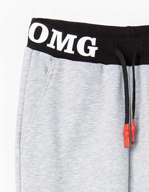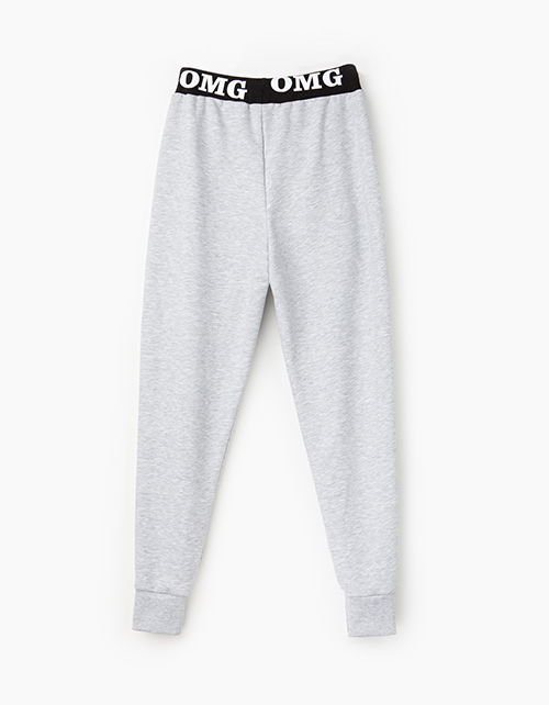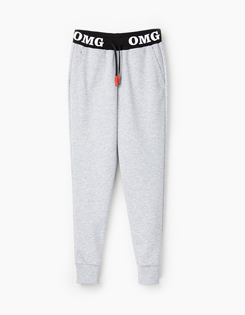 Спортивные брюки с манжетами для мальчика-подростка. Пошиты из светло-серого меланжевого футера. Пояс с затяжкой на шнурок выполнен из черной рибаны с контрастным дизайнерским принтом. Функциональные карманы спереди.