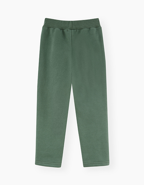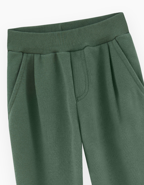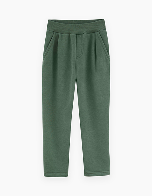 Прямые брюки для мальчика. Выполнены из трикотажного полотна с браш-эффектом в трендовом оттенке "Темный лес". Комфортная модель на эластичном поясе с наклонными боковыми карманами.