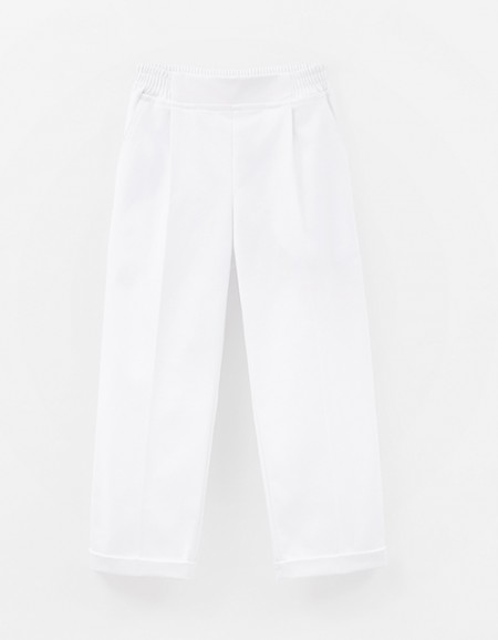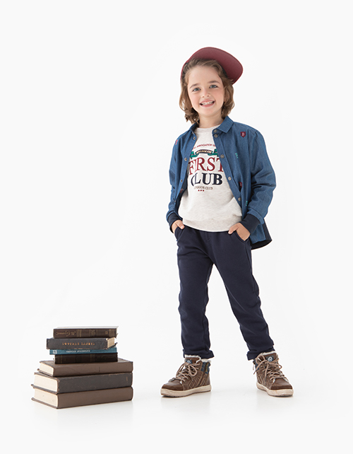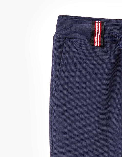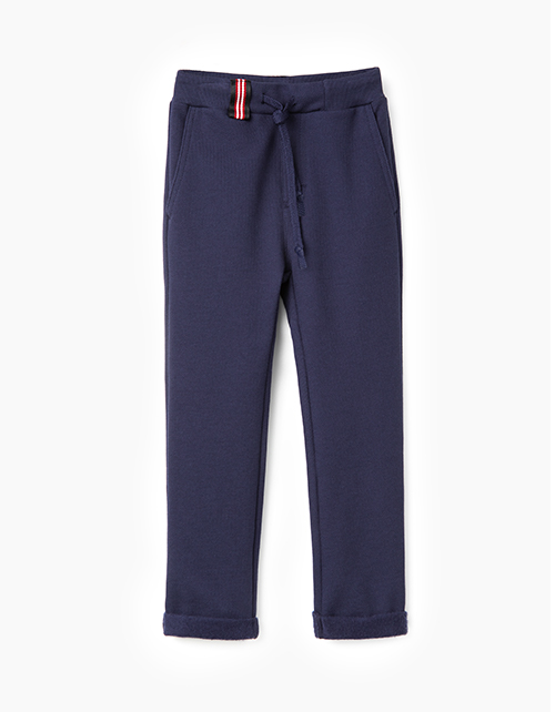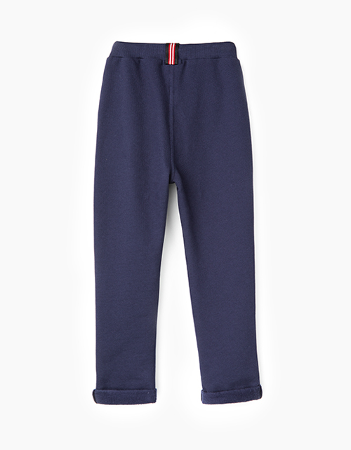 Брюки модного силуэта с отворотами для мальчика. Из темно-синего футера с начесом. Эластичный пояс из рибаны регулируется шнуром. Декорирован шлевками из тесьмы в полоску спереди и сзади. Функциональные карманы спереди.