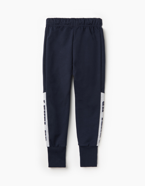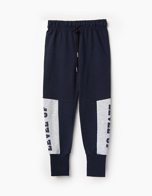 Стильные трикотажные брюки спортивного силуэта для мальчика. Из синего футера с серыми меланжевыми вставками по низу спереди. На вставках - контрастный принт Level up ("Повышай уровень"). Пояс регулируется шнуром