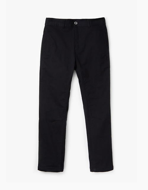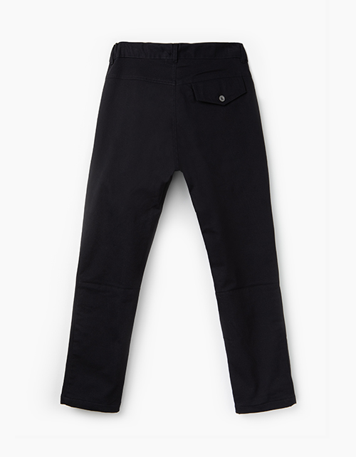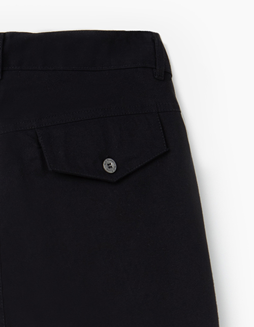 Утепленные брюки модного прямого силуэта для мальчика. Выполнены из черного твила. Застежка на молнию и металлический болт. Пояс со шлевками для ремня. Функциональные карманы спереди. Кокетка и карман с клапаном сзади