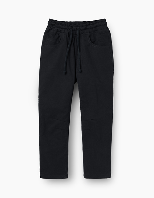 Утепленные брюки узкого прямого силуэта. Выполнены из черного твила с подкладкой из флиса. На мягком поясе с регулировкой шнуром. Функциональные карманы спереди и сзади. Практичная модель на каждый день