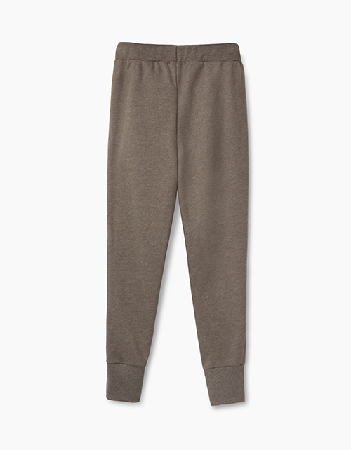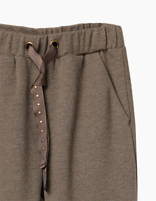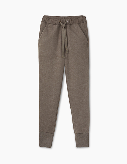 Свободные, зауженные книзу брюки для девочки-подростка. Выполнены из меланжевого футера цвета хаки. Высокие манжеты, карманы-хулиганы. Пояс на эластичной ленте регулируется тесьмой. Сочетаются с любым "верхом" коллекции