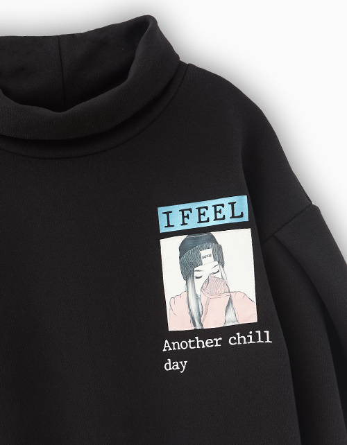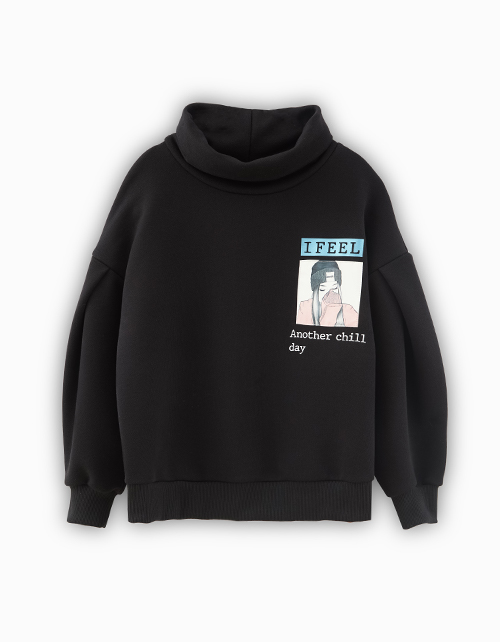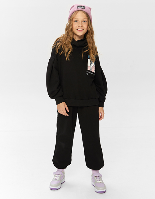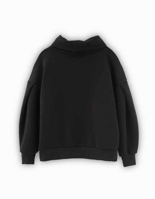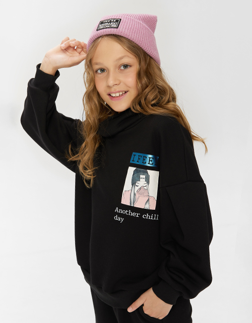 Стильный черный свитшот для девочки. Комфортная модель с воротником-трубой, спущенным плечом и объемными рукавами.
