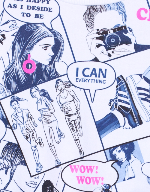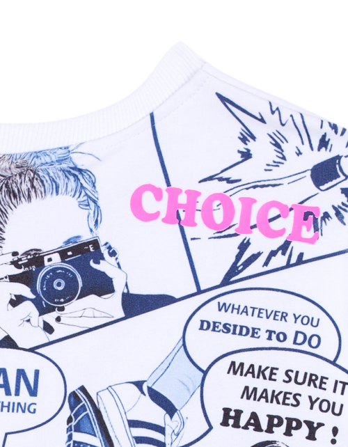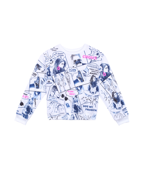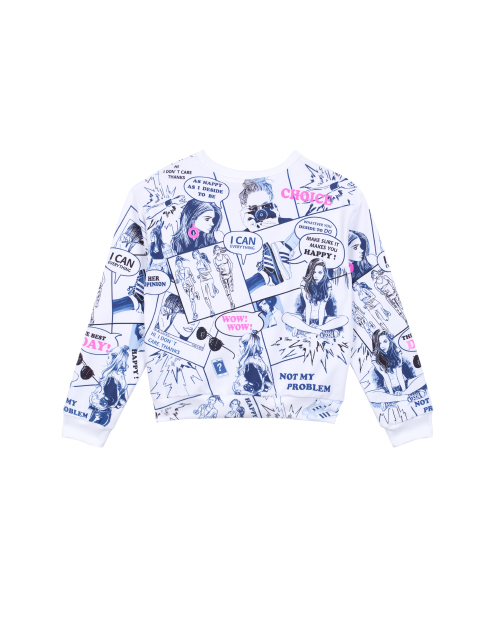 Набивной джемпер для девочки с круглым вырезом горловины. Манжеты и резинка из рибаны. Дизайнерское оформление лицевой стороны и спинки в стилистике капсулы "Миллион лайков".