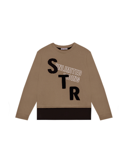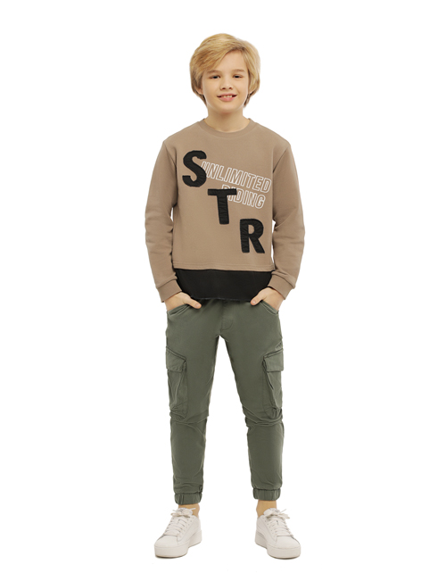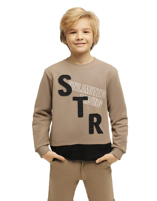Бежевый джемпер для мальчика с длинным рукавом на манжетах из рибаны. Прямой силуэт с имитацией многослойности. Круглый вырез горловины из рибаны. Принт в стилистике капсулы "Городские джунгли".