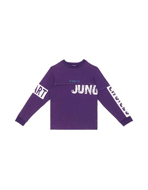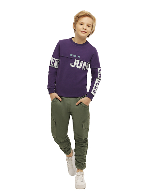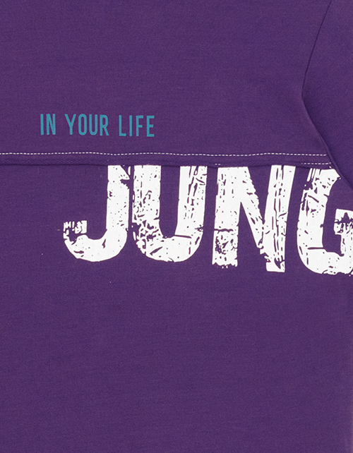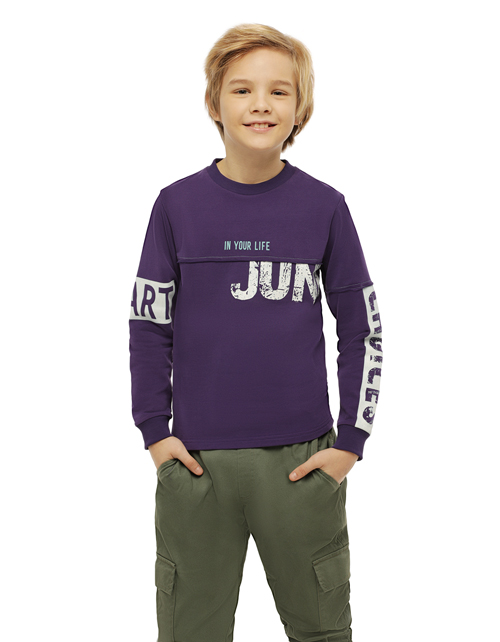 Джемпер для мальчика прямого силуэта баклажанного цвета. Рукава на манжетах из рибаны. Принт в стилистике капсулы "Городские джунгли".