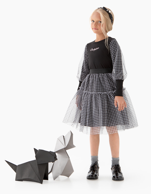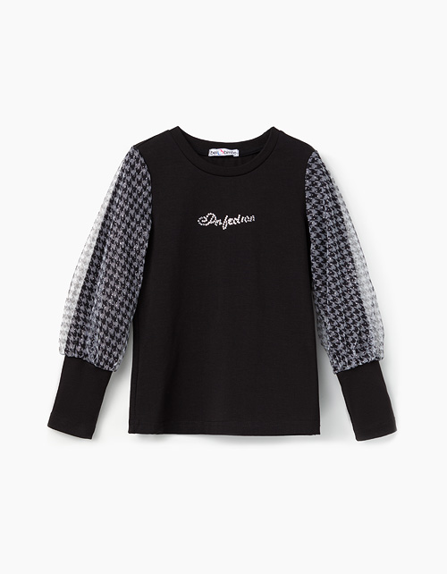 Джемпер полуприлегающего силуэта с декором из страз для девочки. Основная ткань - черная кулирная гладь с начесом. Рукава с высокими манжетами покрыты сверху слоем сетчатого полотна с принтом "гусиная лапка" и блестками
