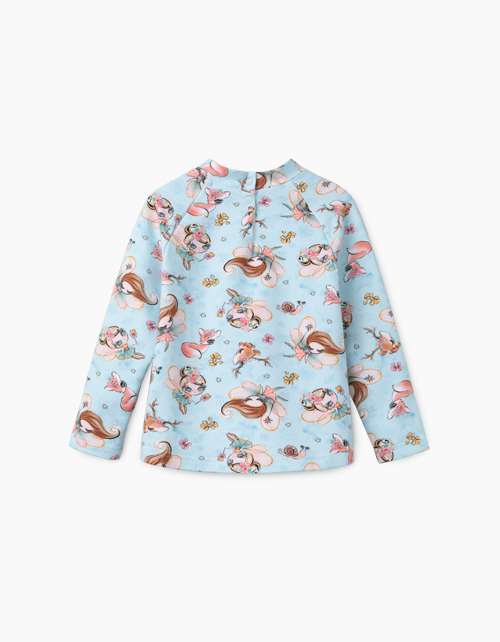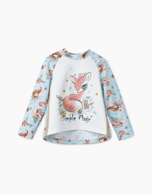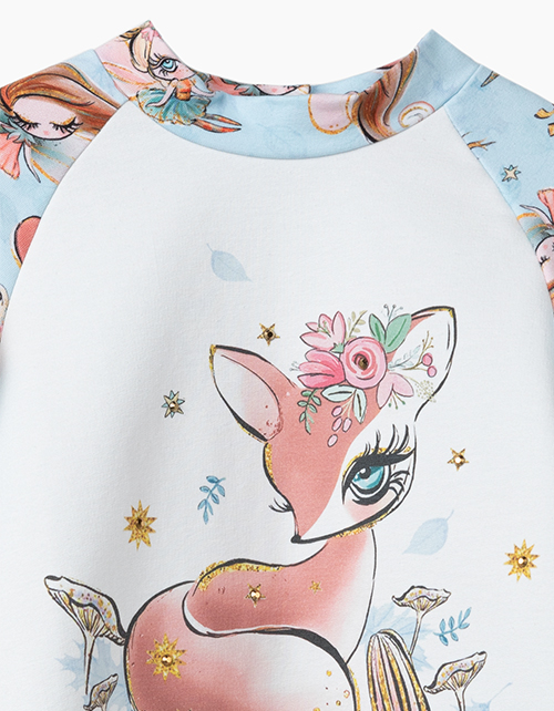 Джемпер полуприлегающего силуэта с рукавом реглан и горловиной-стоечкой. Выполнен из комбинации набивного и однотонного футера. Фантазийный принт спереди. Декоративные лампасы со стразами по бокам. Застежка на спинке