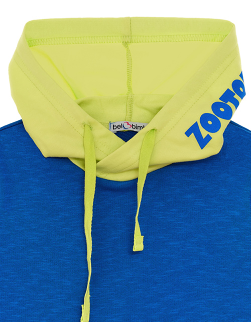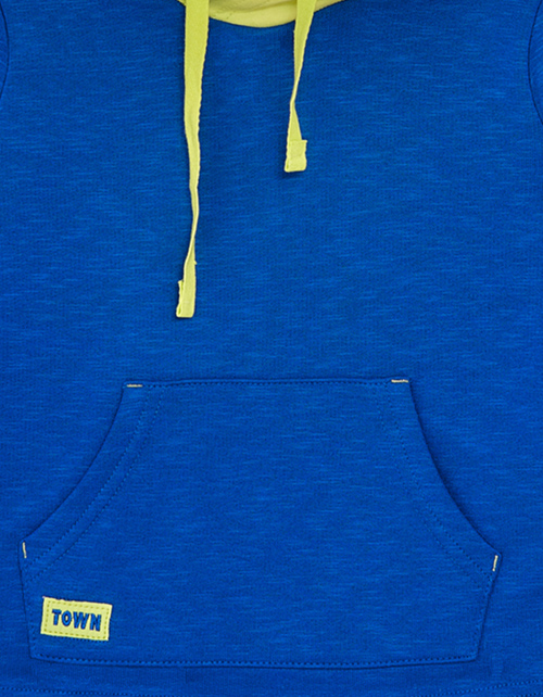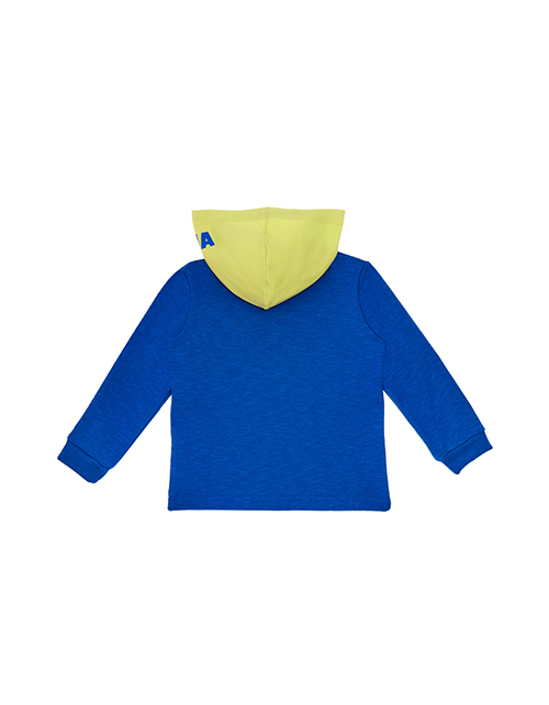 Худи для мальчика цвета василек. Манжеты из рибаны. Капюшон с регулировкой на шнурке, карман-кенгуру. Принт и нашивка в стилистике капсулы "Стильный маршрут".