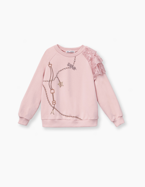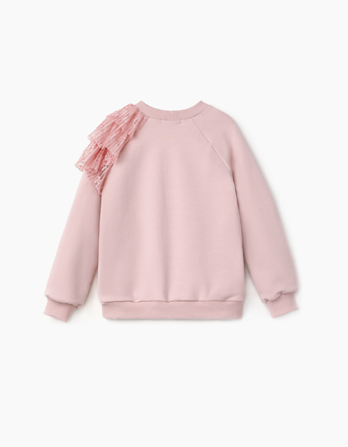 Коралловый трикотажный джемпер для девочки. Свободного силуэта, с рукавом реглан. Декор из кружева по левому плечу перекликается с ассиметричным принтом, украшенным аппликацией из страз и искусственным жемчугом