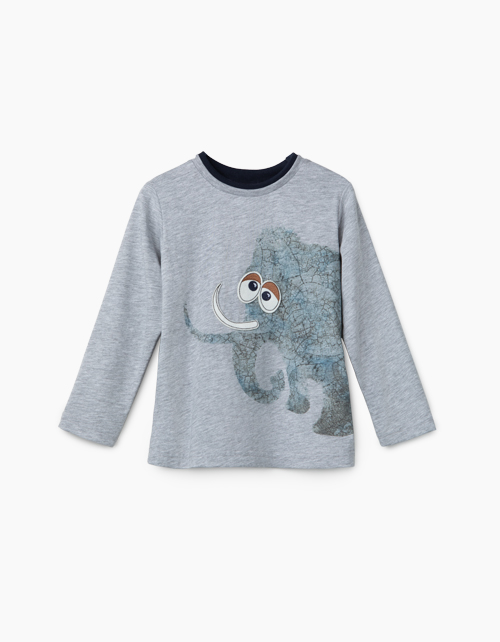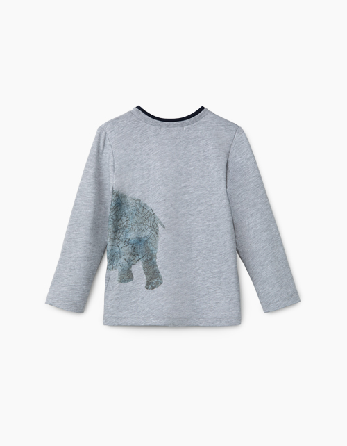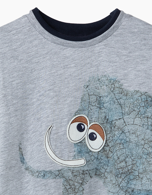 Джемпер прямого силуэта из серого меланжа. С контрастной отделкой по горловине. Декорирован изображением мамонта, переходящим с переда на спинку, украшенного вышитыми деталями. Модель выполнена из кулирной глади