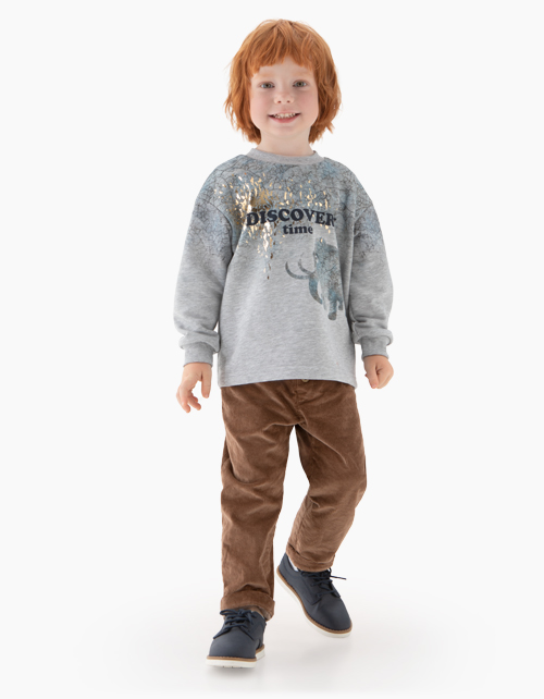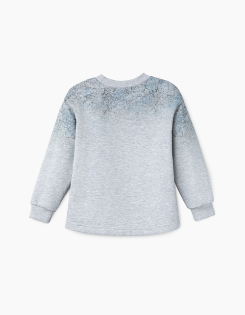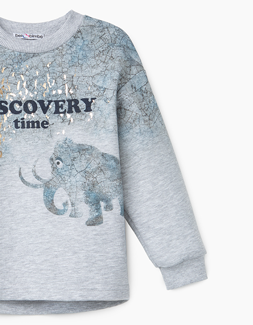 Джемпер из светло-серого меланжевого футера. Прямой силуэт со спущенным рукавом. Принт с использование золотистой фольги и надписью Discovery time ("Время открытий") на груди. Горловина и рукава отделаны рибаной
