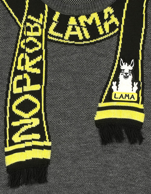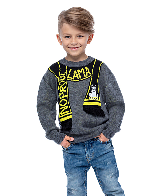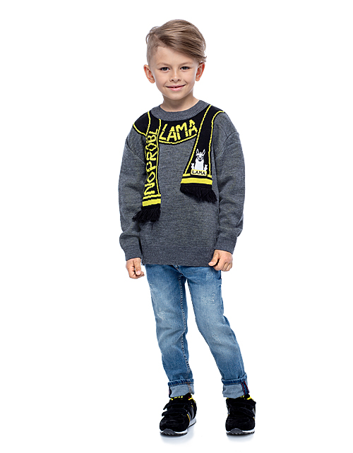 Джемпер для мальчика имеет свободный силуэт и стильный фасон. Изделие дополнено рисунком в виде шарфа с ламой и отлетными элементами, круглым вырезом горловины и манжетами на рукавах. Смешанная пряжа имеет плотную вязку и надолго сохранит внешний вид.