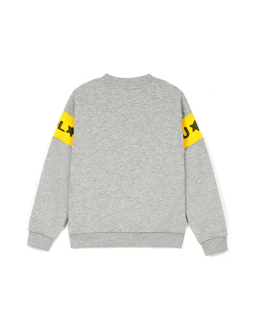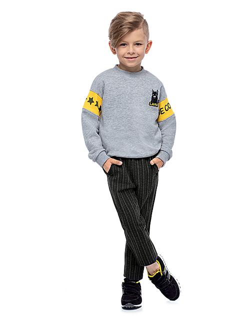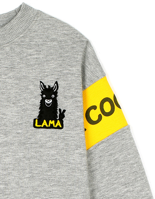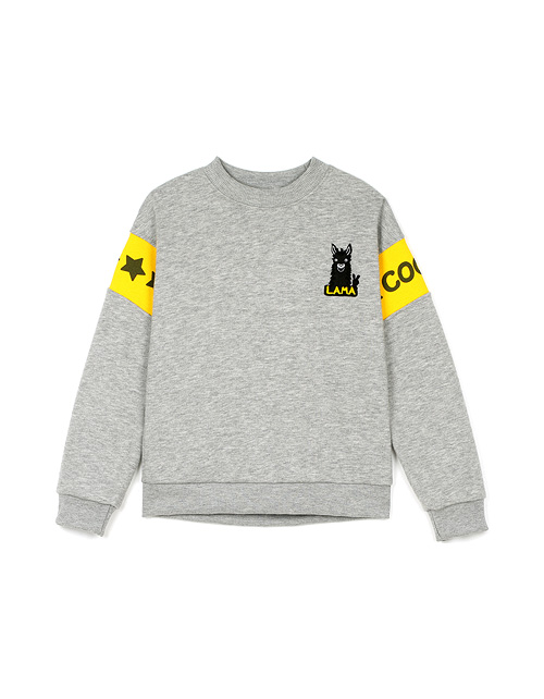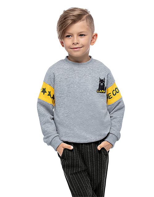 Джемпер для мальчика в цвете светло-серый меланж имеет круглый вырез горловины, манжеты на рукавах и стильный принт в виде ламы на груди и контрастных полос с надписями на рукавах. Ткань футер выдержит много стирок без потери внешнего вида изделия.
