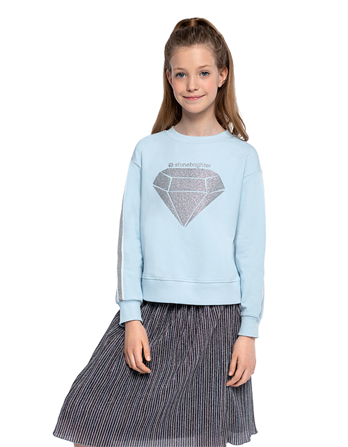 Джемпер для девочки свободного силуэта с круглым вырезом горловины дополнен стильным рисунком в виде алмаза на груди, манжетами и лампасами на рукавах. Трикотажная ткань футер обеспечивает износостойкость изделия и комфорт в носке.