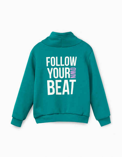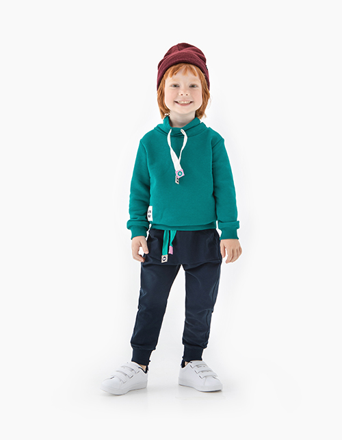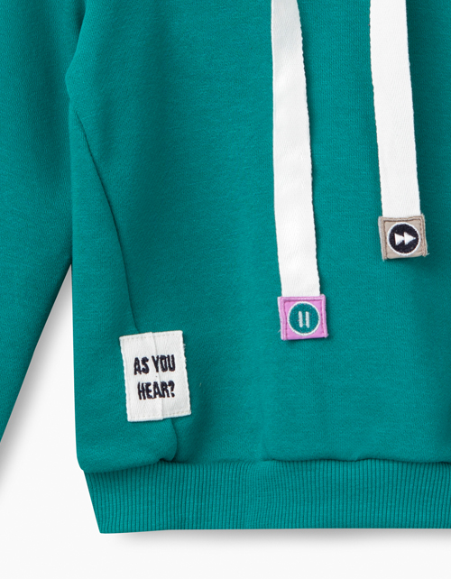 Джемпер свободного силуэта из футера малахитового цвета. Длинный рукав, спущенная линия плеча, воротник-хомут. Низ изделия и манжеты отделаны рибаной. Декорирован вышивкой на киперной тесьме и термотрансферной печатью