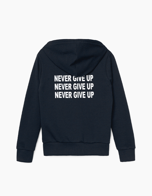 Темно-синее худи прямого силуэта на застежке-молнии для мальчика. Основная ткань - футер, отделка из рибаны. Декорирован текстовыми принтами спереди и сзади: One way ("Односторонний"), Never give up ("Никогда не сдавайся")