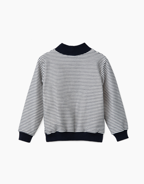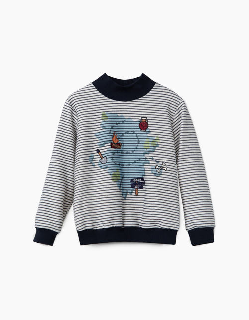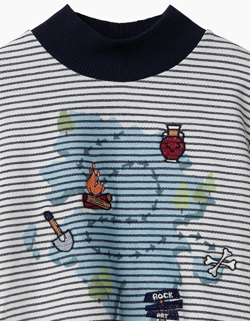 Трикотажный джемпер прямого силуэта в узкую полоску. Длинный рукав. Пояс, горловина и манжеты из однотонной рибаны контрастного цвета. Декорирован принтом и вышивкой. Спереди надпись ROCK ART ("наскальная живопись")