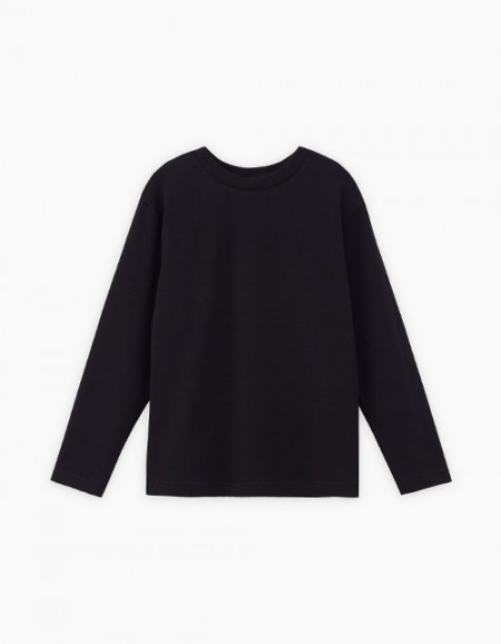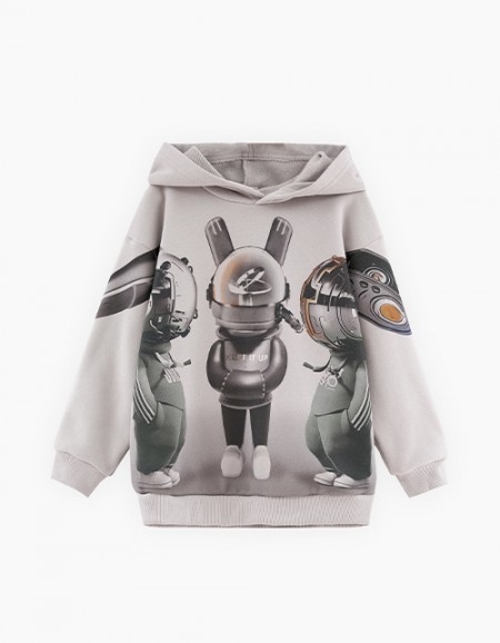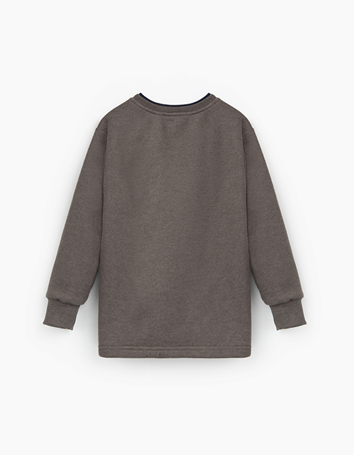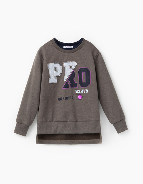 Трикотажный джемпер прямого силуэта с удлиненной спинкой для мальчика. Основная ткань - меланжевый футер цвета хаки. Рукава, горловина и низ изделия спереди отделаны рибаной. Перед декорирован вышивкой и принтом