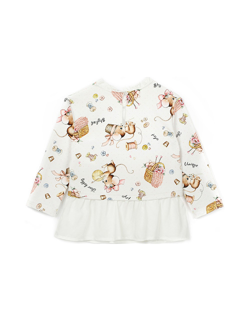 Джемпер для девочки с принтом в виде мышек имеет свободный крой и дополнен баской из плательной вискозы. Круглая горловина джемпера с юбкой украшена сборками, а застежка молния расположена на спинке. Ткань футер дарит приятные тактильные ощущения.