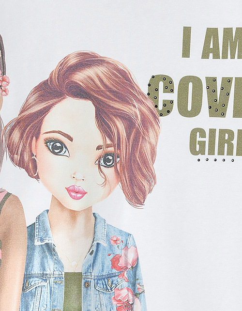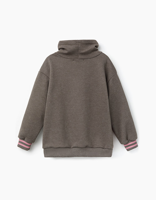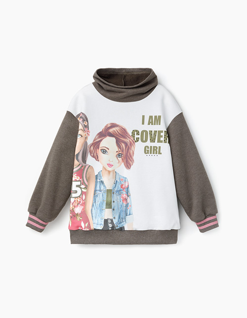 Удлиненный джемпер-худи для девочки. Свободный силуэт, высокий ниспадающий воротник. Изделие выполнено из двух видов футера. Манжеты и низ - из рибаны. Спереди - яркий принт с надписью, украшенной черными стразами