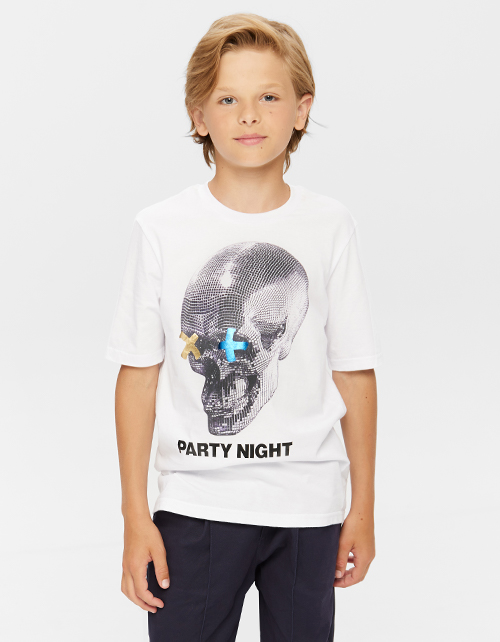 Стильная белая футболка для мальчика. Модель с тематическим принтом капсулы EVENT. Halloween Party