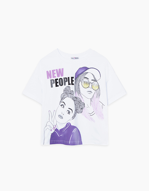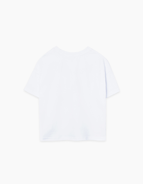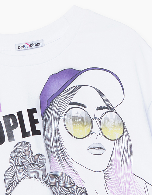 Стильная белая футболка объемного силуэта с круглой горловиной. Выполнена из кулирной глади с эластаном. Декорирована авторским принтом в стилистике капсулы, шрифтовым трансфером из цветной пленки и аппликацией из прозрачного пластика