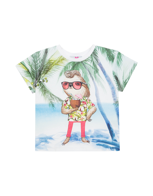 Вашему малышу очень понравится стильная футболка с весёлым принтом. Жизнерадостный ленивец, попивающий коктейль на экзотическом острове, позабавит маленького мальчика. Натуральная ткань подарит комфорт в течение дня
