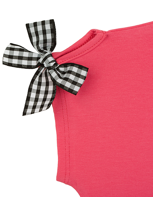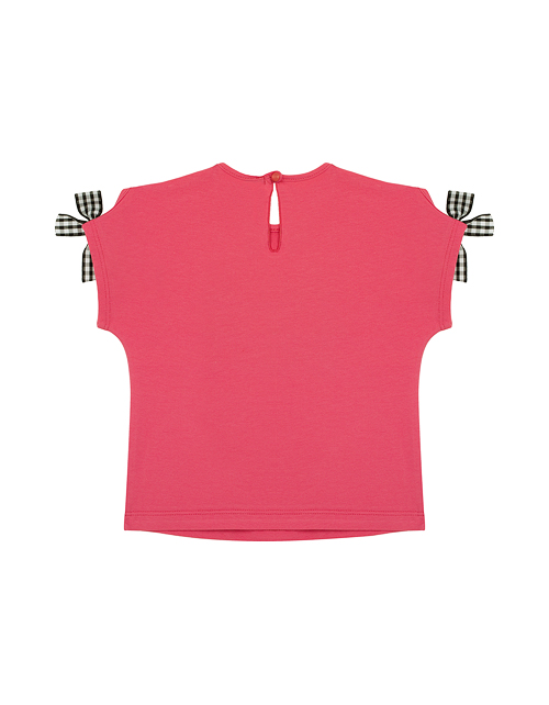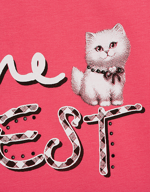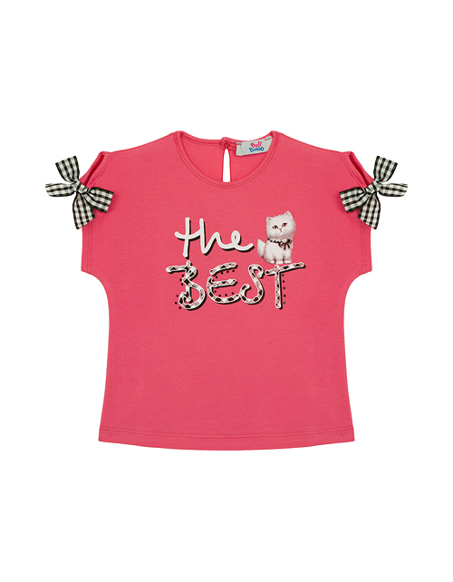 Яркий привлекательный джемпер с коротким рукавом обязательно понравится маме и её дочке! Особую прелесть этой комфортной модели придает чудесный принт с изображением милого пушистого котенка и бантики на плечиках. Мягкая натуральная ткань дарит комфорт
