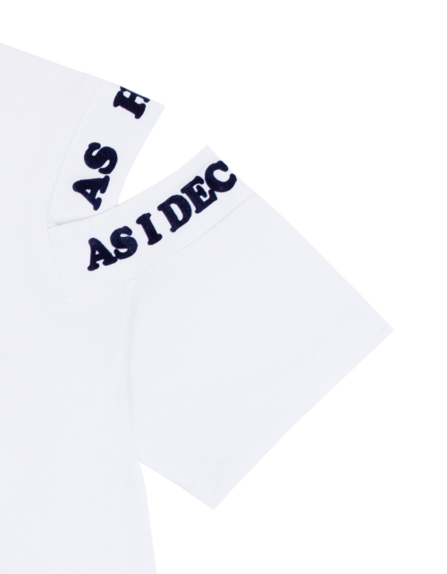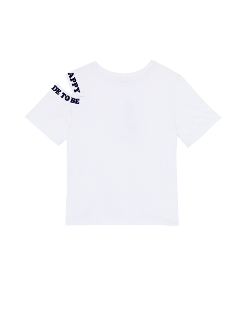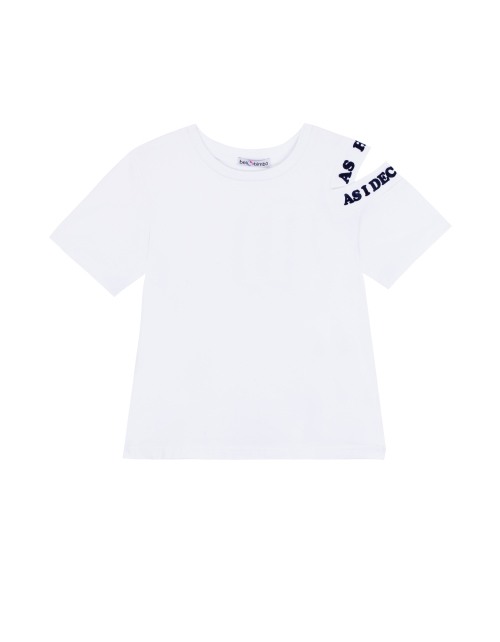 Белая футболка для девочки с круглой горловиной. Вырез на рукаве, принт-надпись в стилистике капсулы "Миллион лайков".