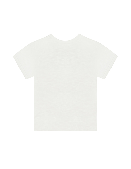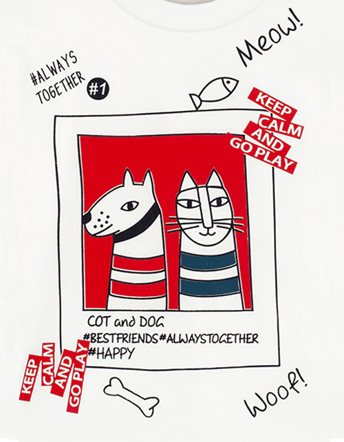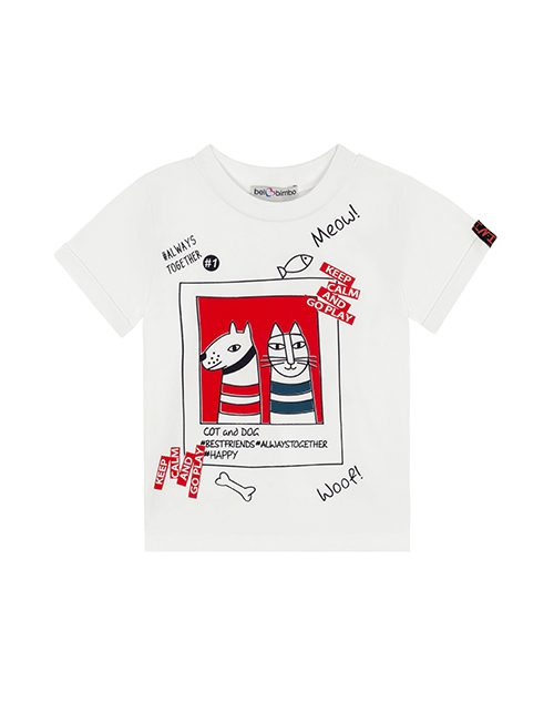 Белая футболка для мальчика с круглым вырезом горловины. Дизайнерское оформление в стилистике капсулы "Кото-пес". Нашивка и подвороты на рукаве.